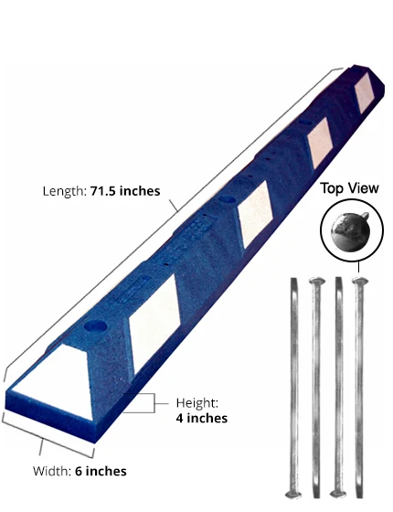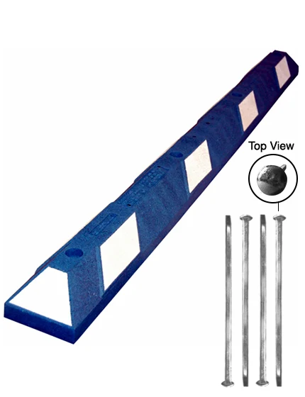 6' Blue Recycled Rubber Parking Block w/White Reflective Tape & 18" Heavy Duty Spikes