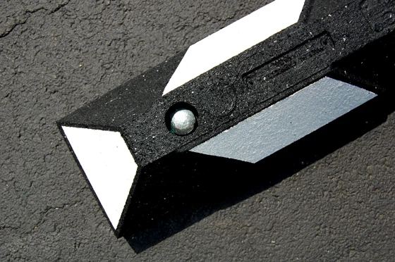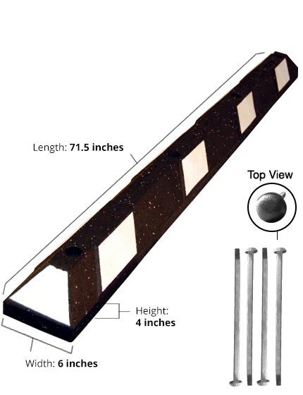 Our 6' rubber parking block is made from 100 percent recycled tires and is designed to endure weather and vehicle contact. This parking stop will flex slightly to lie flat on cracked or uneven surfaces – ideal for older and high-volume commercial parking lots. The six foot recycled rubber parking block comes in handicapped blue or black with high visibility yellow or white reflective strips. Four (4) counter-sunk mounting holes per 6' block.