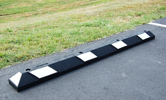 Our 6' rubber parking block is made from 100 percent recycled tires and is designed to endure weather and vehicle contact. This parking stop will flex slightly to lie flat on cracked or uneven surfaces – ideal for older and high-volume commercial parking lots. The six foot recycled rubber parking block comes in handicapped blue or black with high visibility yellow or white reflective strips. Four (4) counter-sunk mounting holes per 6' block.