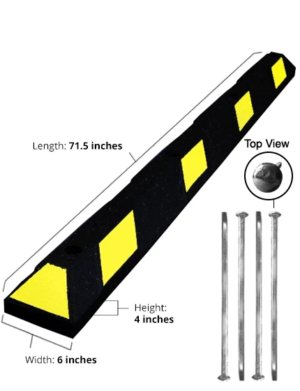 6' Recycled Rubber Parking Block w/Yellow Reflective Tape & 18" Heavy Duty Spikes
