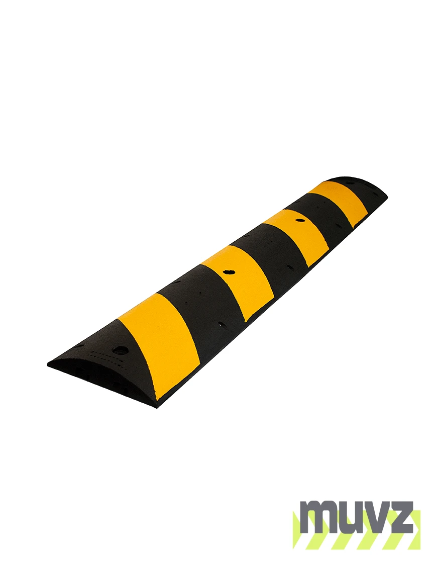 Heavy-Duty Speed Bump - Solid rubber (no channels) for demanding applications - High traffic areas or heavy vehicles like trucks and buses. The Heavy Duty 6-foot rubber speed bump safely slows car speeds to 2 to 5 mph. Helps calm and slow traffic in parking lots and private roads. Recessed bolt holes in the six foot rubber speed bump make it easy to install and remove. Made from 100% recycled tires so there's no internal hardware – an added safety benefit.
