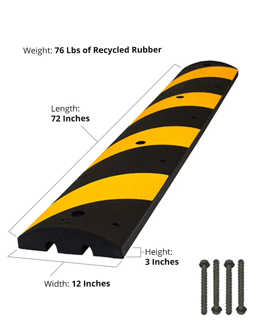 Our Oversized Alley speed bumps were developed specifically to address speeding and cut-through traffic in city alleyways, behind shopping centers, and in other areas where it is essential to slow the speed of trucks and cars for safety. They typically slow cars and trucks to almost a stop. These larger sized speed bumps are 6 feet long, twelve inches wide, three inches tall at the highest point, and weigh approximately 76 lbs.