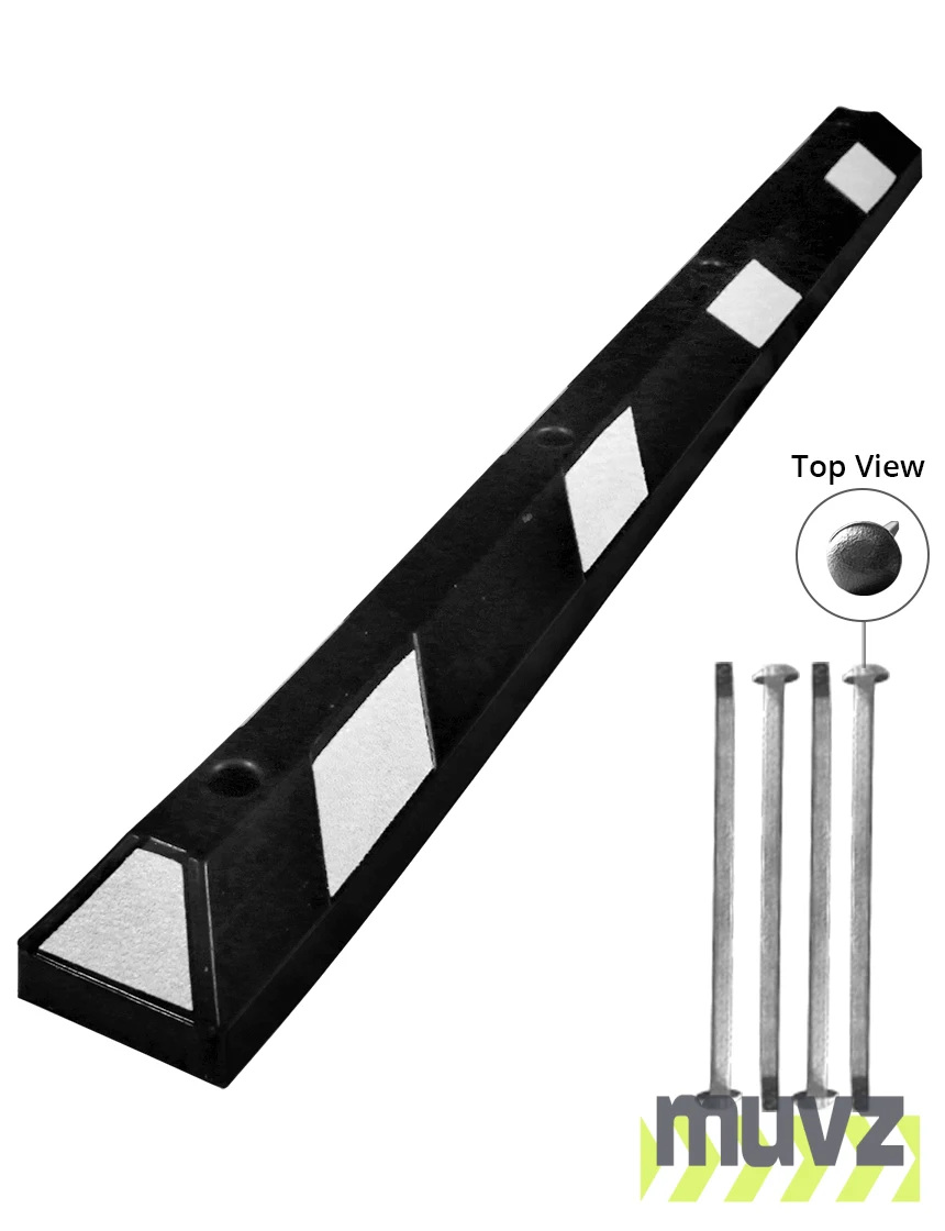 Our Best Value in a 'Full Sized' Rubber Parking Block. Weighing 28 lbs each they are extremely sturdy and durable, but can be carried and installed by only one person. These Rubber Wheel Stops are made exclusively for Muvz from a durable masticated rubber compound consisting of approximately 65% pre-consumer recycled rubber and 35% post-consumer recycled rubber. Muvz brand rubber parking blocks have 4 counter-sunk mounting holes per block and all installation hardware is included.