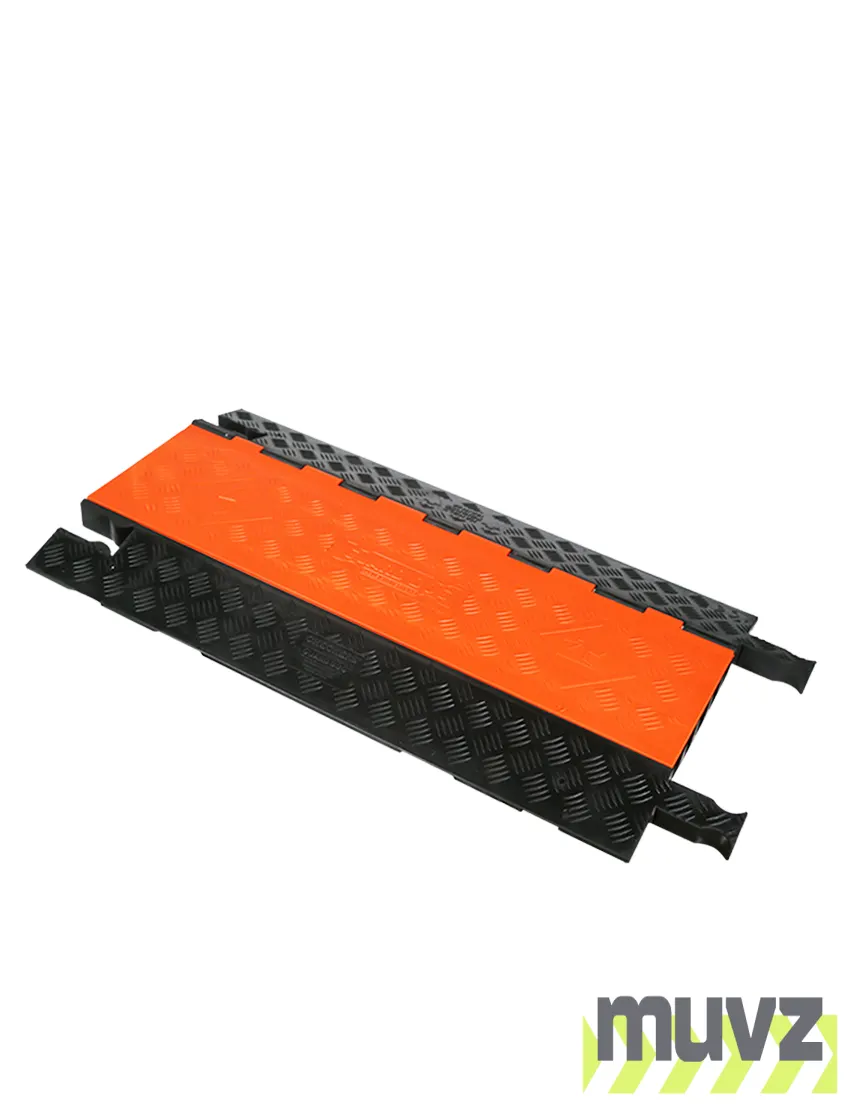 Guard Dog® 5-channel cable protector with hinged lid provides a safe crossing for vehicle and pedestrian traffic while protecting valuable electrical cables and hose lines from damage. The modular interlocking design is ideal for use in amusement parks, entertainment venues, sporting events, and most public, commercial, industrial, construction, and utility applications.