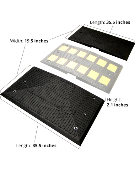Speed Bump End Cap sections should be paired with Middle Sections as needed for a complete Speed Hump installation. Fully recyclable and made from extremely durable 100 percent recycled tires, these speed hump end caps are easy to attach and give speed humps a solid, finished appearance.