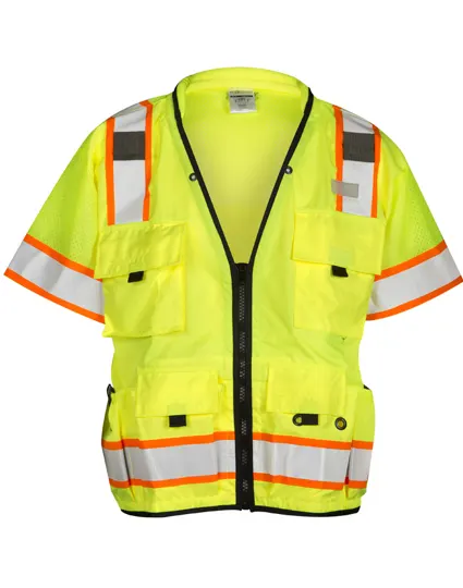 This is our highest quality Class 3 Surveyors Vest, made with a solid polyester front and with mesh back for greater comfort. Vest has a zipper front closure, reinforced with durable webbing for strength. 2” wide high performance reflective material is laminated to 3” contrasting color. This class 3 surveyors vest also has left and right mic tabs, 2 lapel grommets, and a padded neck for comfort.