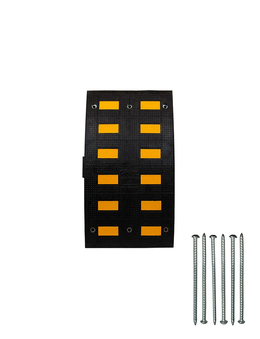 rubber speed humps allow you to construct speed hump of virtually any width that is 35.5” across. Being much more gentle than speed bumps, emergency vehicles do not need to slow down as much (if at all) when they cross these highly visible and reflective recycled rubber speed humps.