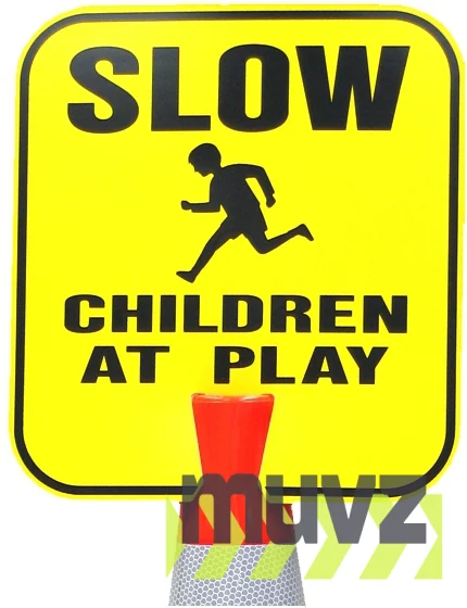 The standard Children At Play clip on sign is bright yellow and double sided to alert motorists traveling in both directions. Weather-resistant and designed with special grooves that securely attach to traffic cones. A necessity for playgrounds, youth sports fields and gymnasiums, and school events.