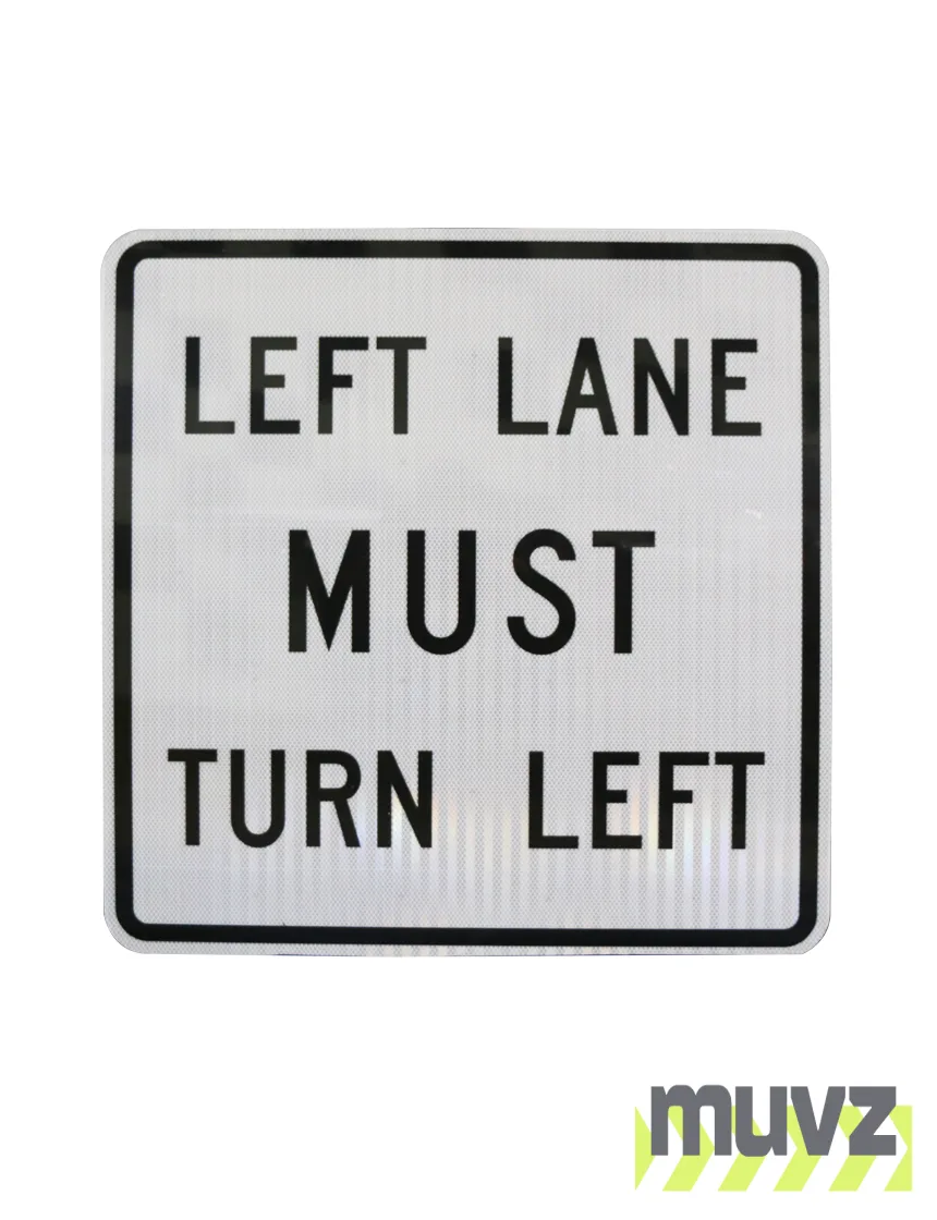 All Muvz Left Lane Must Turn Left Signs are 3 mil. High Intensity Prismatic Reflective Sheeting by 3M meets ASTM D4956 Type III & IV and comes with a ten (10) year performance warranty.